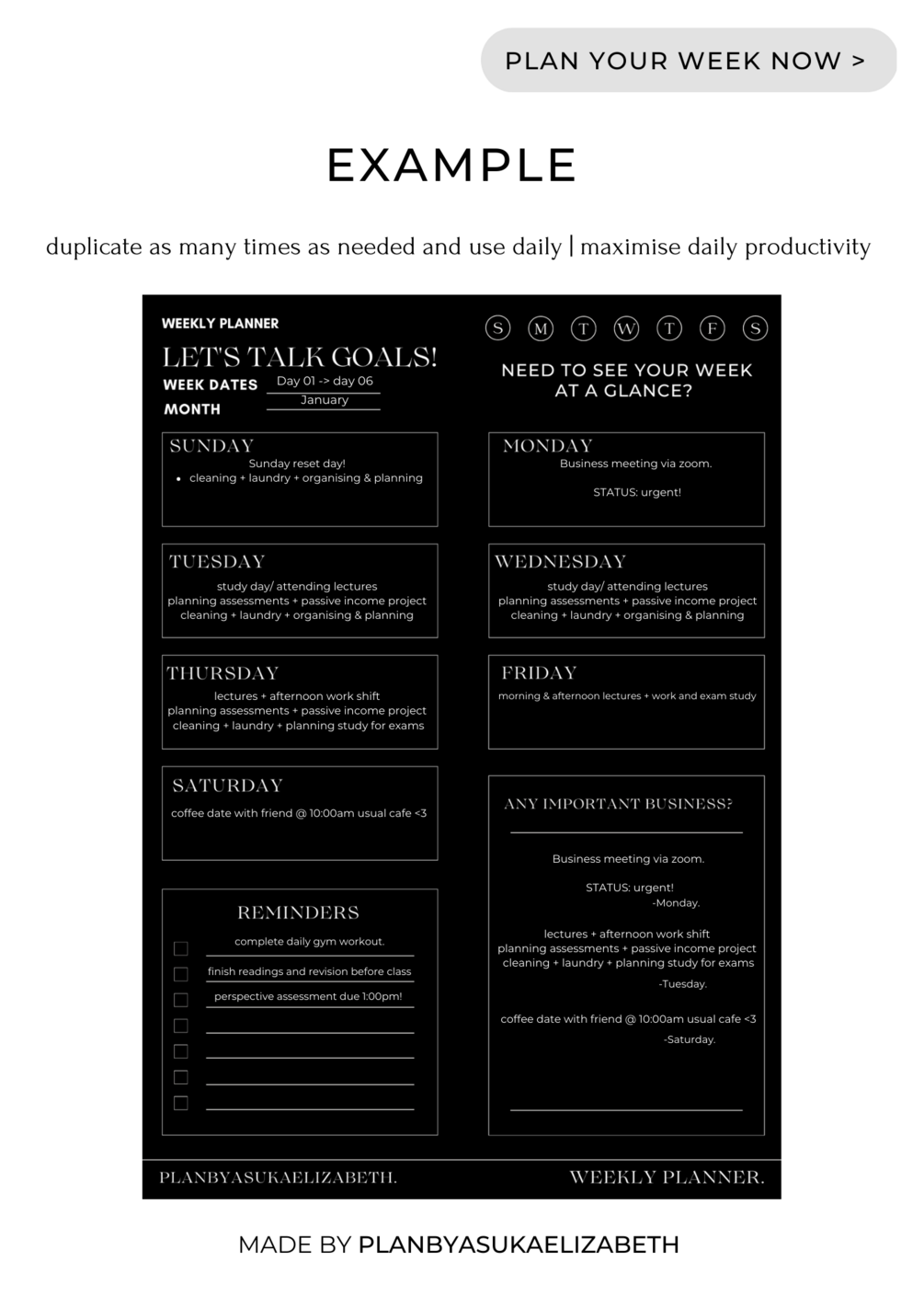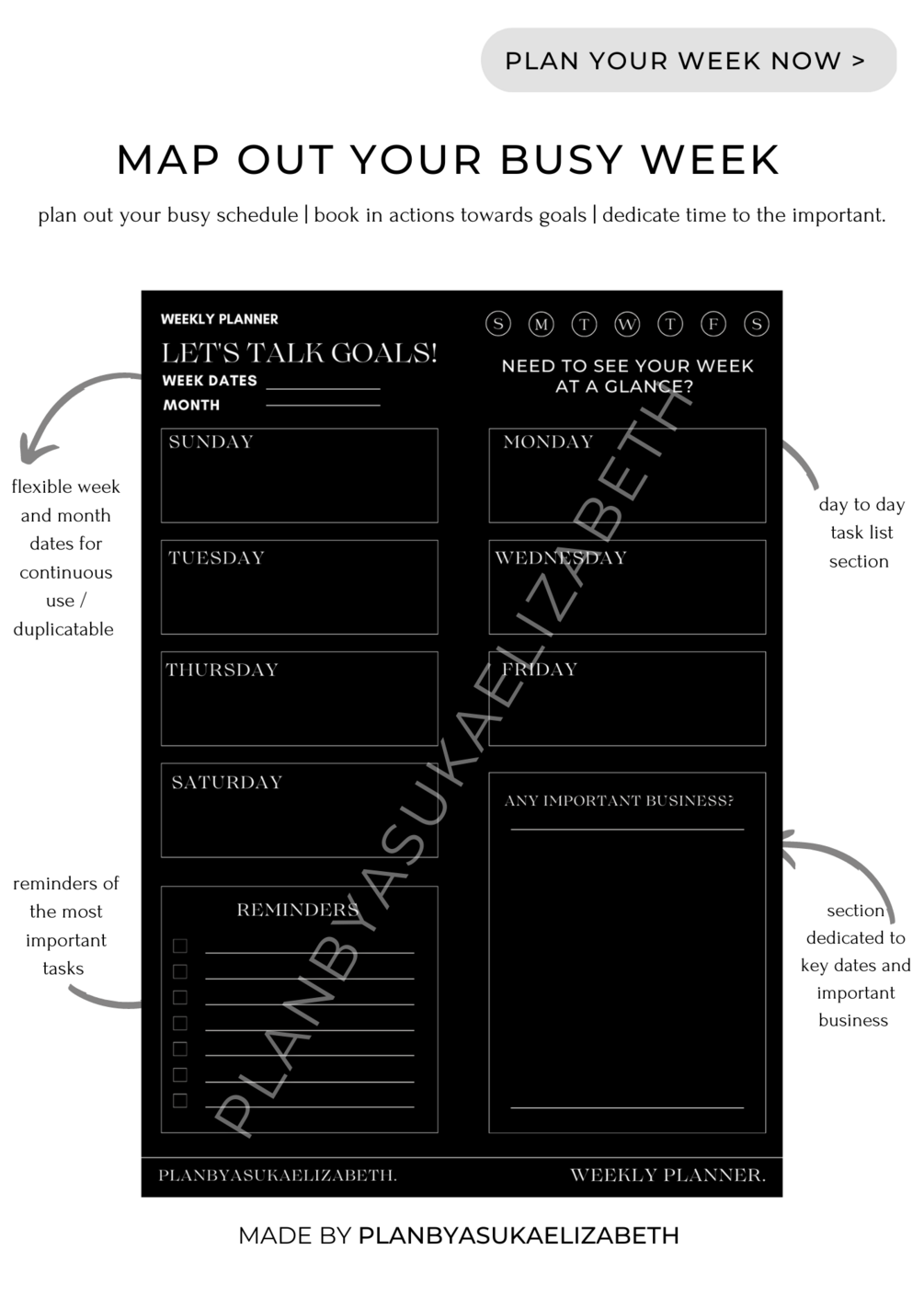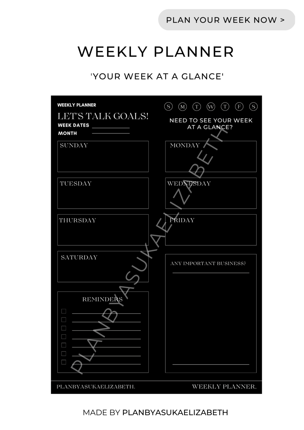 With this weekly planner, you'll get weekly tables to write in short day summaries from Monday to Sunday to view your week at a glance. With this planner you'll also get a reminders list and an importance area to keep track of the most vital tasks.